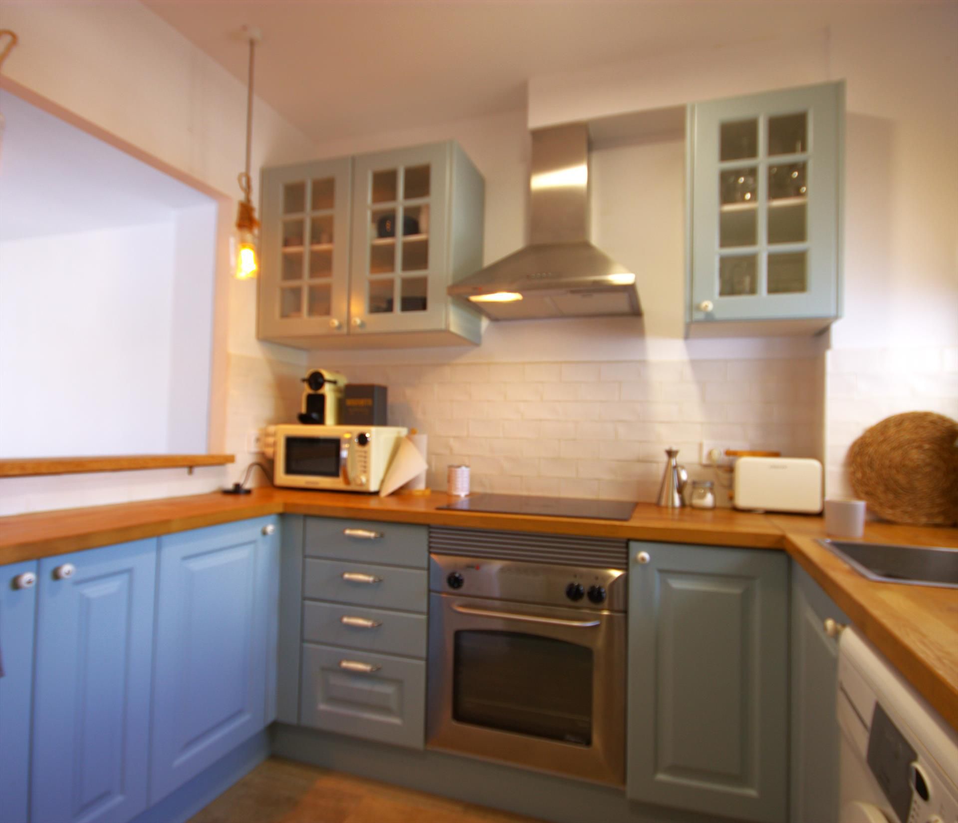 • cocina americana con cocina eléctrica, horno eléctrico, microondas, refrigerador-congelador, cafetera, calentador de agua y tostador