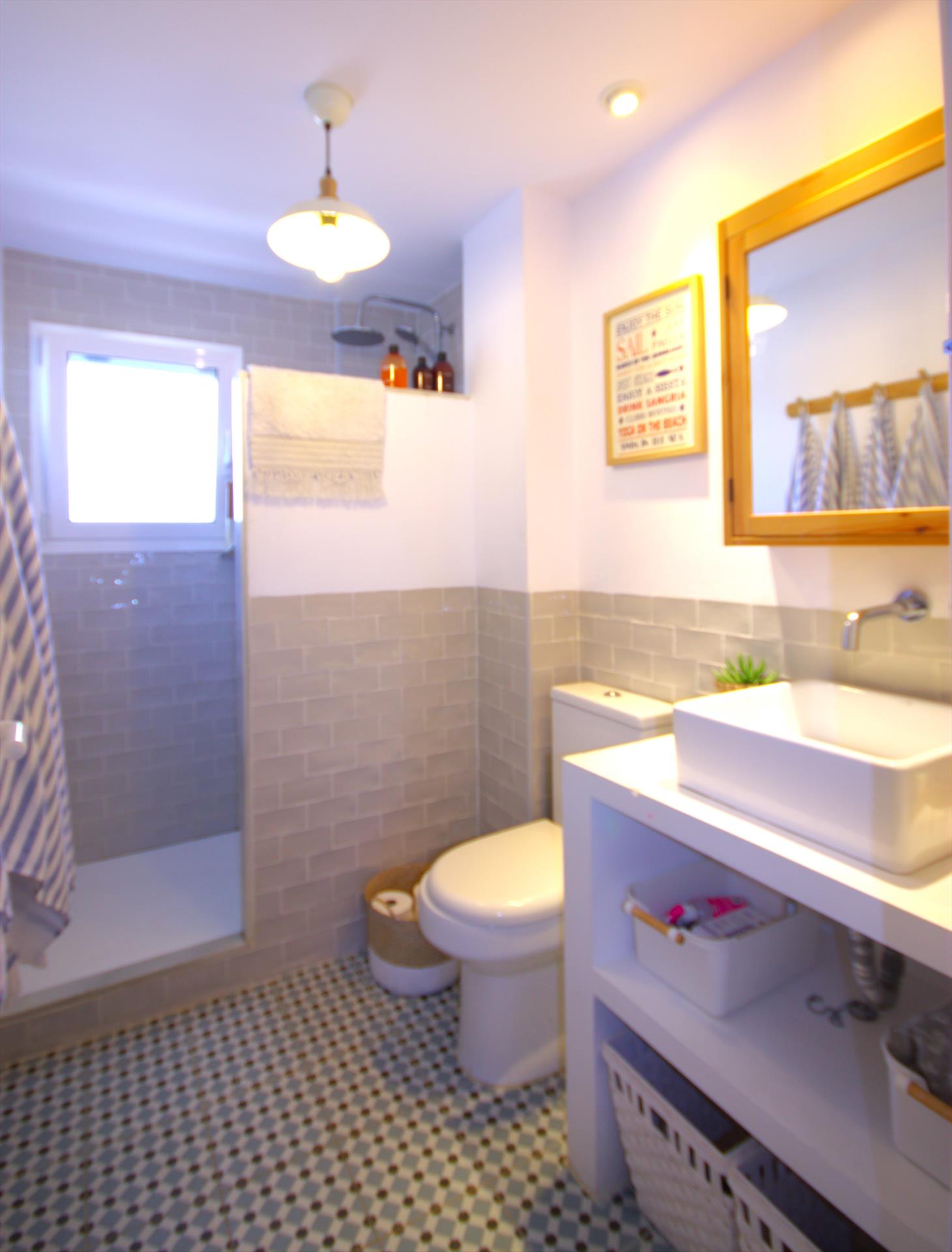 • cuarto de baño con lavabo, ducha y water