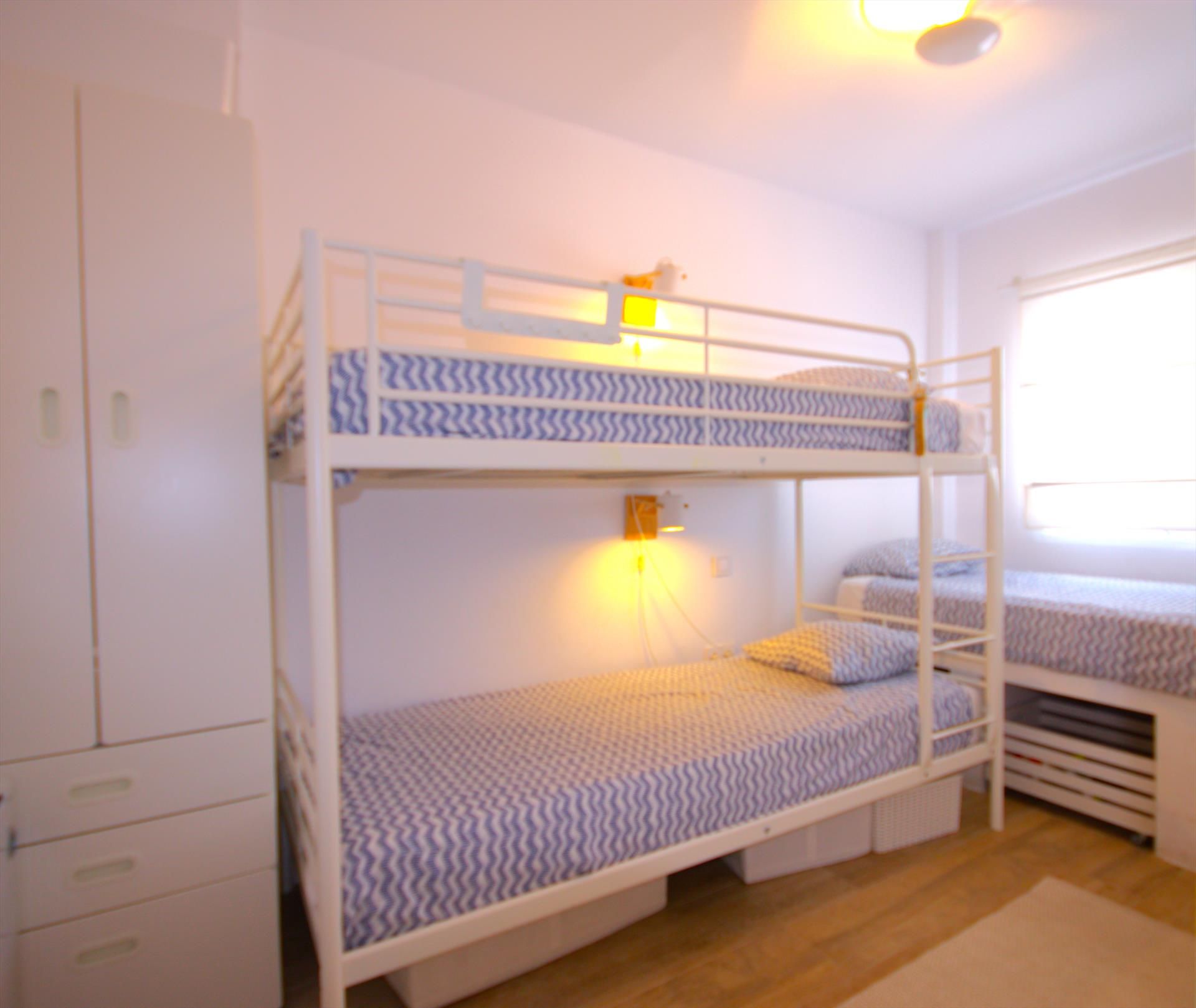 • dormitorio con cama individual (de 190 x 80cm), 2 camas literas (de 190 x 80cm) y ventilador
