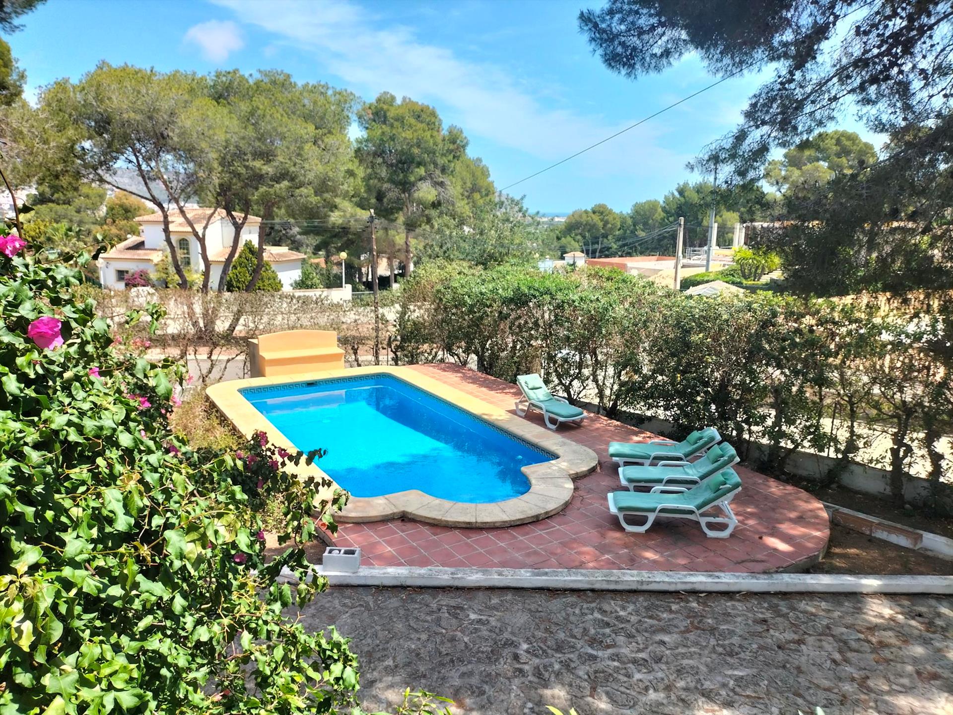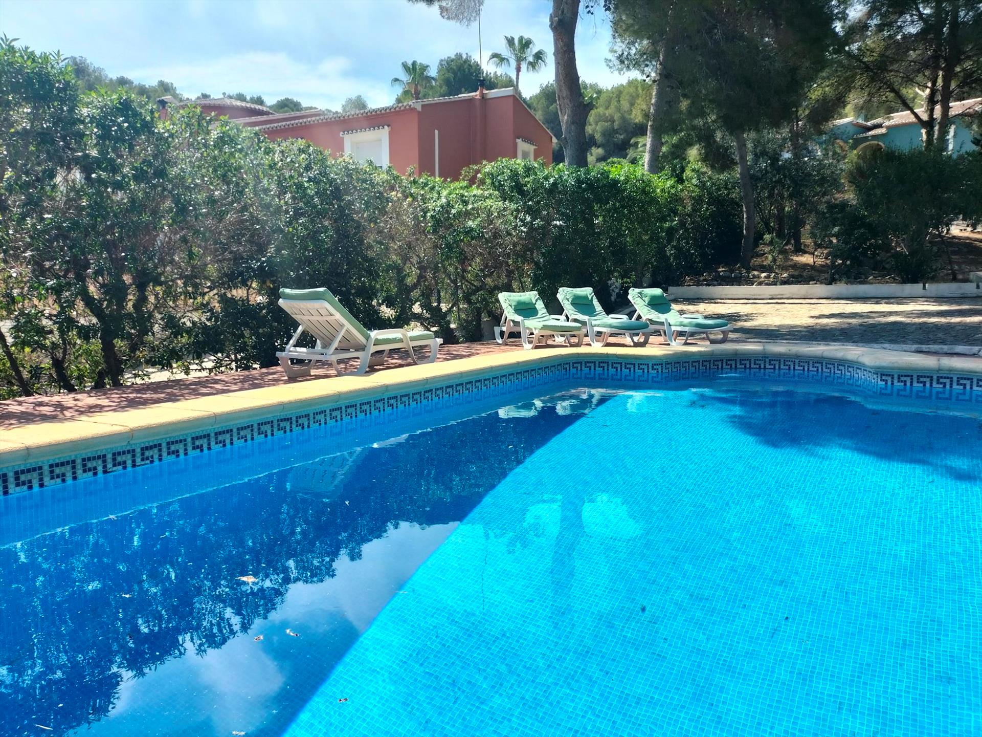 Belle maison de vacances confortable à Javea, Costa Blanca, Espagne avec piscine privée pour 7 personnes. La maison de vacances est située dans une région côtière, boisée et résidentielle et à 4 km de la plage de El Arenal.